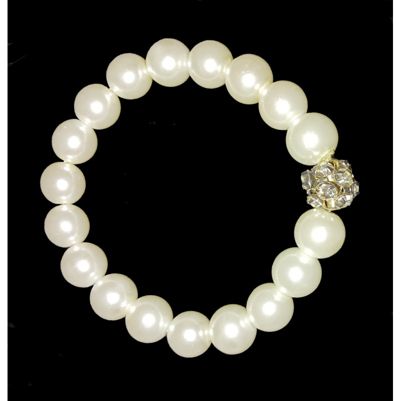 This single  strand pearl bracelet is made with 18 10-mm glass pearls with a sparkly focal round rhinestone bead.  The bracelet has a measurement of a 3-inch diameter but with its stretch fits up to a 6-1/2" wrist.  It pairs well with our Aria necklace.