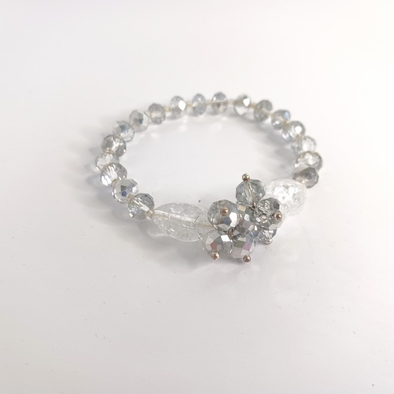 Young teen? This bracelet features faceted semi-clear glass beads 8-mm x 5-mm separated by 2-mm glass beads with a focal point composed of 2 clear glass beads each measuring 18-mm x 10-mm surrounding a unique berry-like arrangement of 9 6-mm round glass beads. The bracelet has a measurement of 3-1/4" diameter but with its stretch fits up to a 7" wrist.