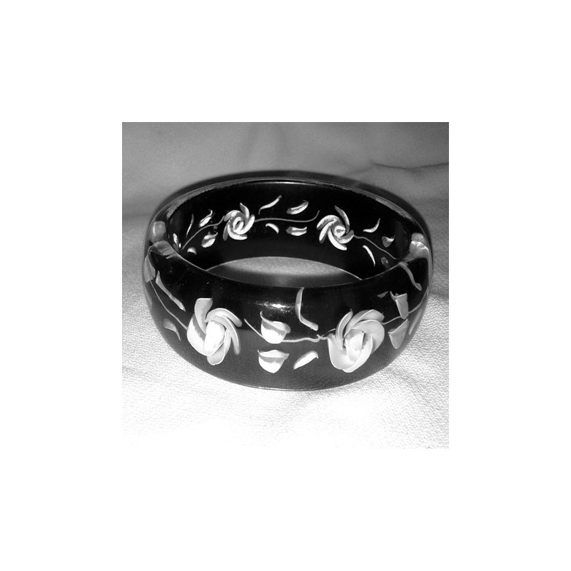 Vintage black acrylic fashion bracelet incised with white flowers, leaves and vines.  Very pretty.  Like new.  No visible wear.  No visible damage.  Approximately 1" high and 2-1/2" diameter.  Medium weight.  Comfortable wear.