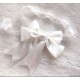 Simple, elegant narrow lace garter supported at the mid-line with a ribbon covered elastic for perfect fit.  Adorned with a  pearl ornament and large satin ribbon and ties.