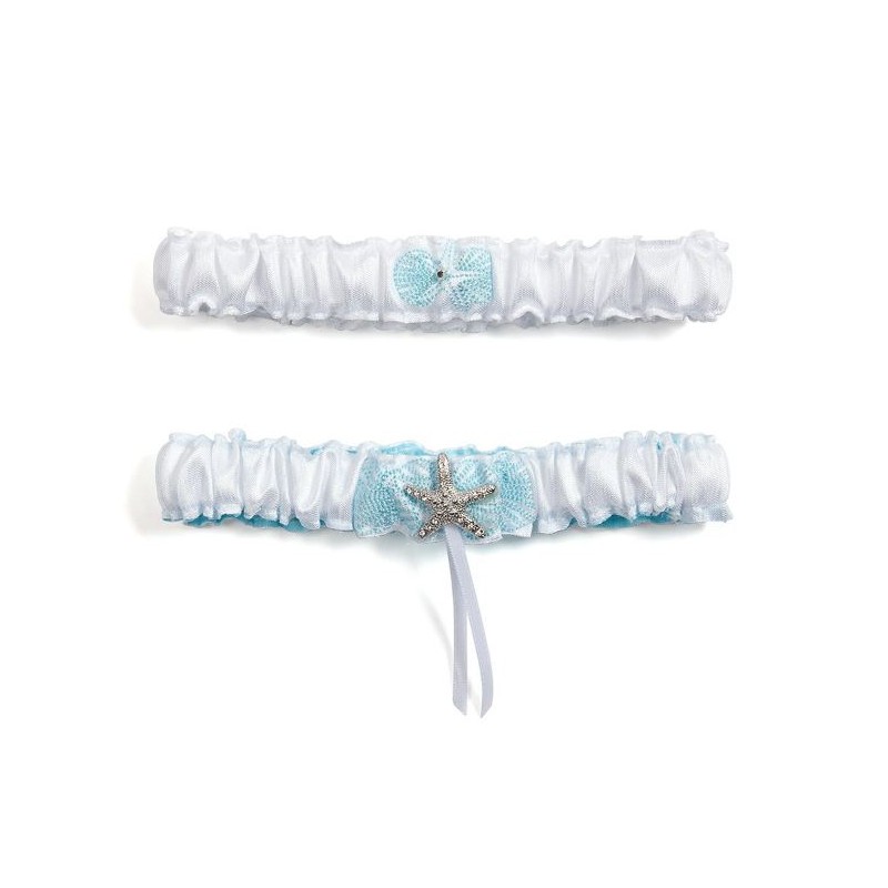 Satin-covered elastic keepsake garter with matching tossing garter. Each are about 1" wide and have outer white satin and inner coloured satin.  Adorned with silk background embroidery.  The keepsake garter comes with a star-shaped gem and grosgrain ribbon, the tossing garter with crystal centre.