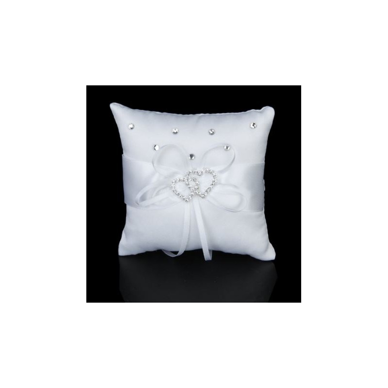 Covered in white satin, this elegant ring bearer pillow is decorated with scattered crystals on the front. A white satin ribbon wraps around the pillow and is accented by a white satin bow and dual rhinestone hearts.