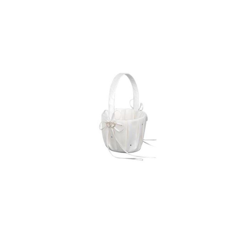 Covered in white pleated satin, this flower girl basket is decorated on each side  with a narrow satin ribbon and dual rhinestone hearts.  The body of the basket is sprinkled with single rhinestone gems.  The handle is constructed of a sturdy band wrapped with white satin ribbon.
